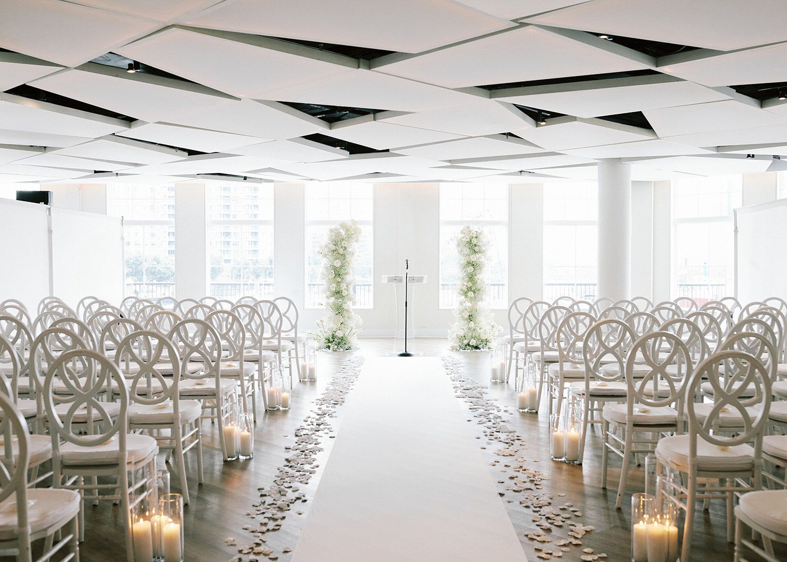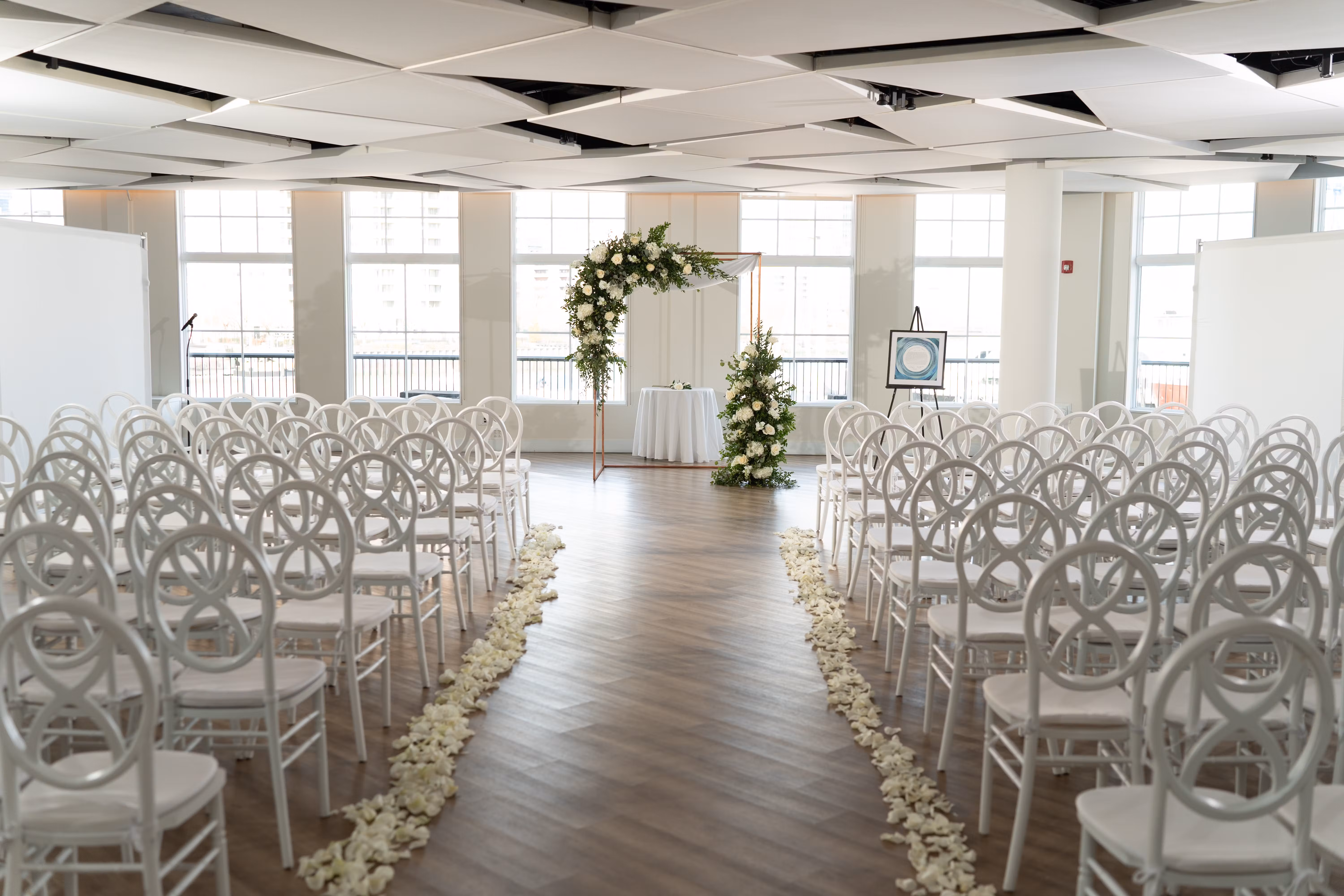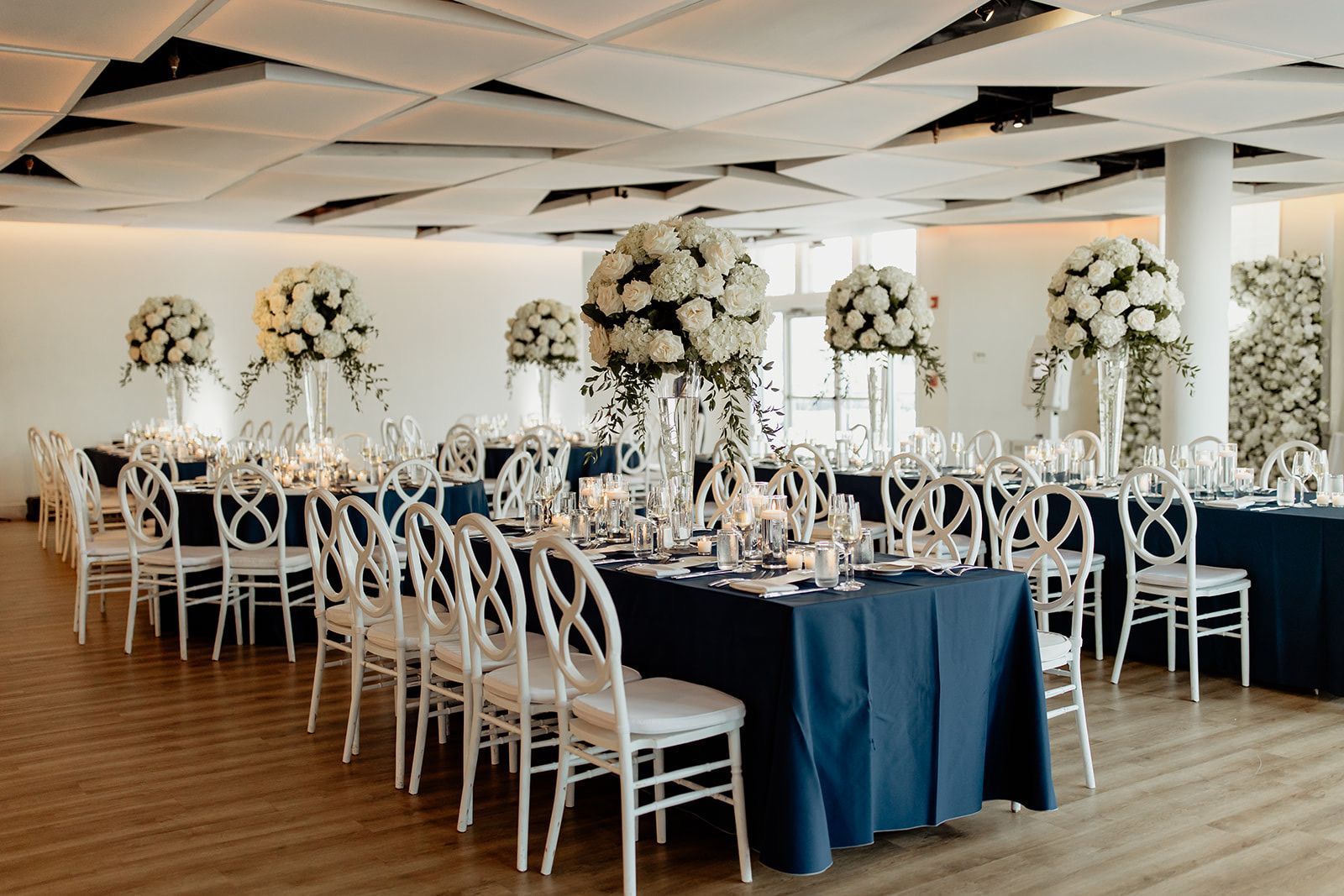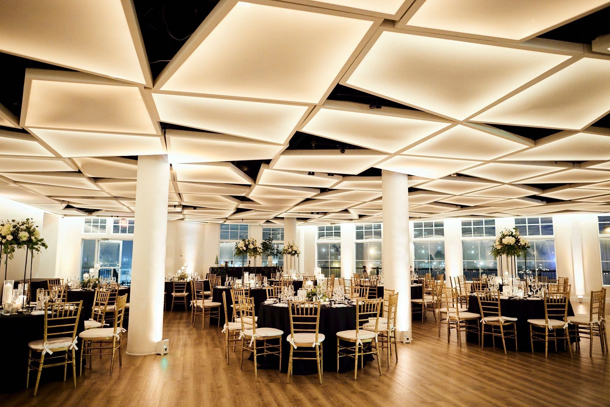 With a glowing, cloudlike ceiling and sleek modern design, our second-story Sky Room brings an ethereal touch to your event. Floor-to-ceiling windows and a 280-degree wraparound terrace offer stunning views of the NYC skyline and Hudson River, while a private staircase leads directly to the marina. The expansive layout accommodates up to 300 guests with a dance floor—perfect for receptions that go all out.